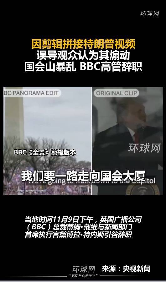 此前,当地时间11月9日下午,英国广播公司(BBC)总裁蒂姆·戴维与新闻部门首席执行官黛博拉·特内斯引咎辞职。导火索是外界批评BBC《全景》栏目通过剪辑拼接美国总统特朗普的演讲视频误导观众。